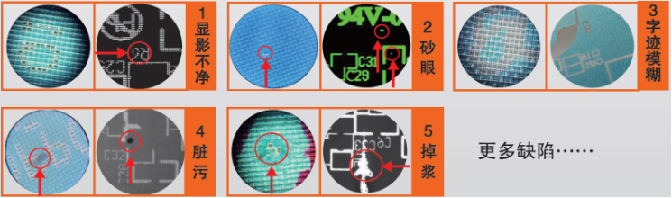 缺陷類型:顯影不凈,字符模糊,沙眼,掉漿,雜物等